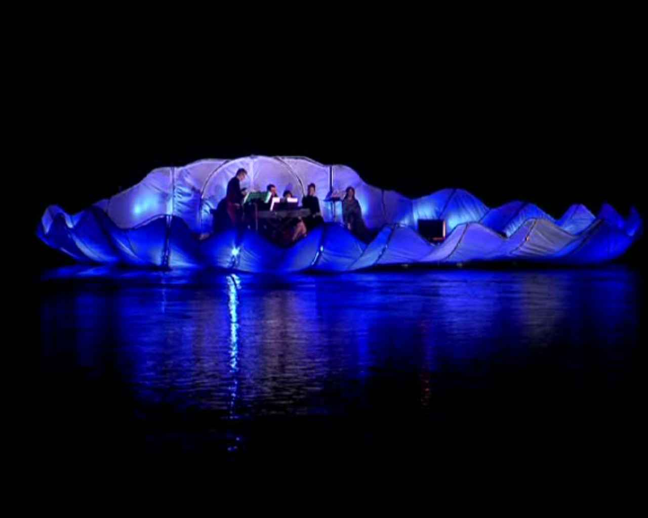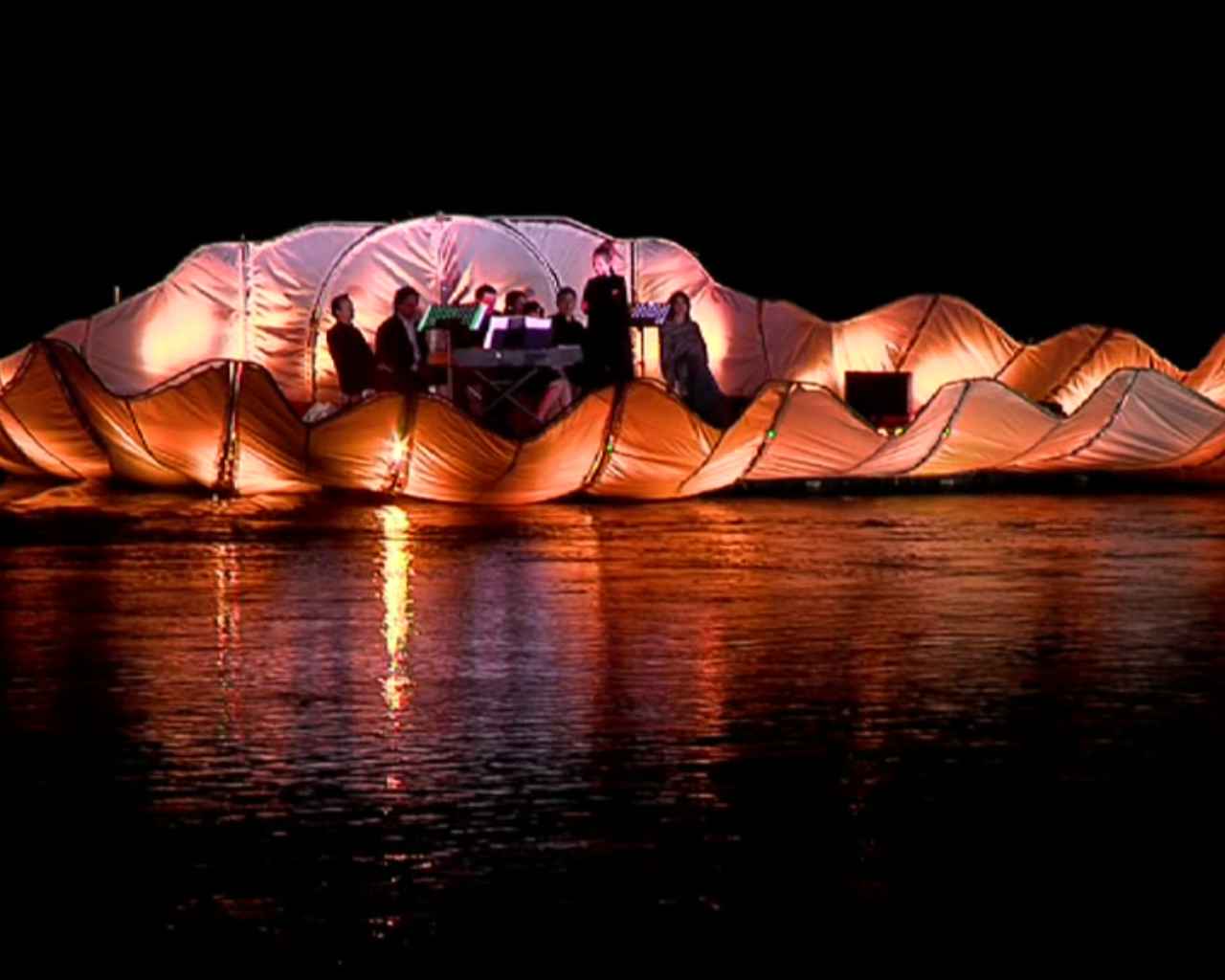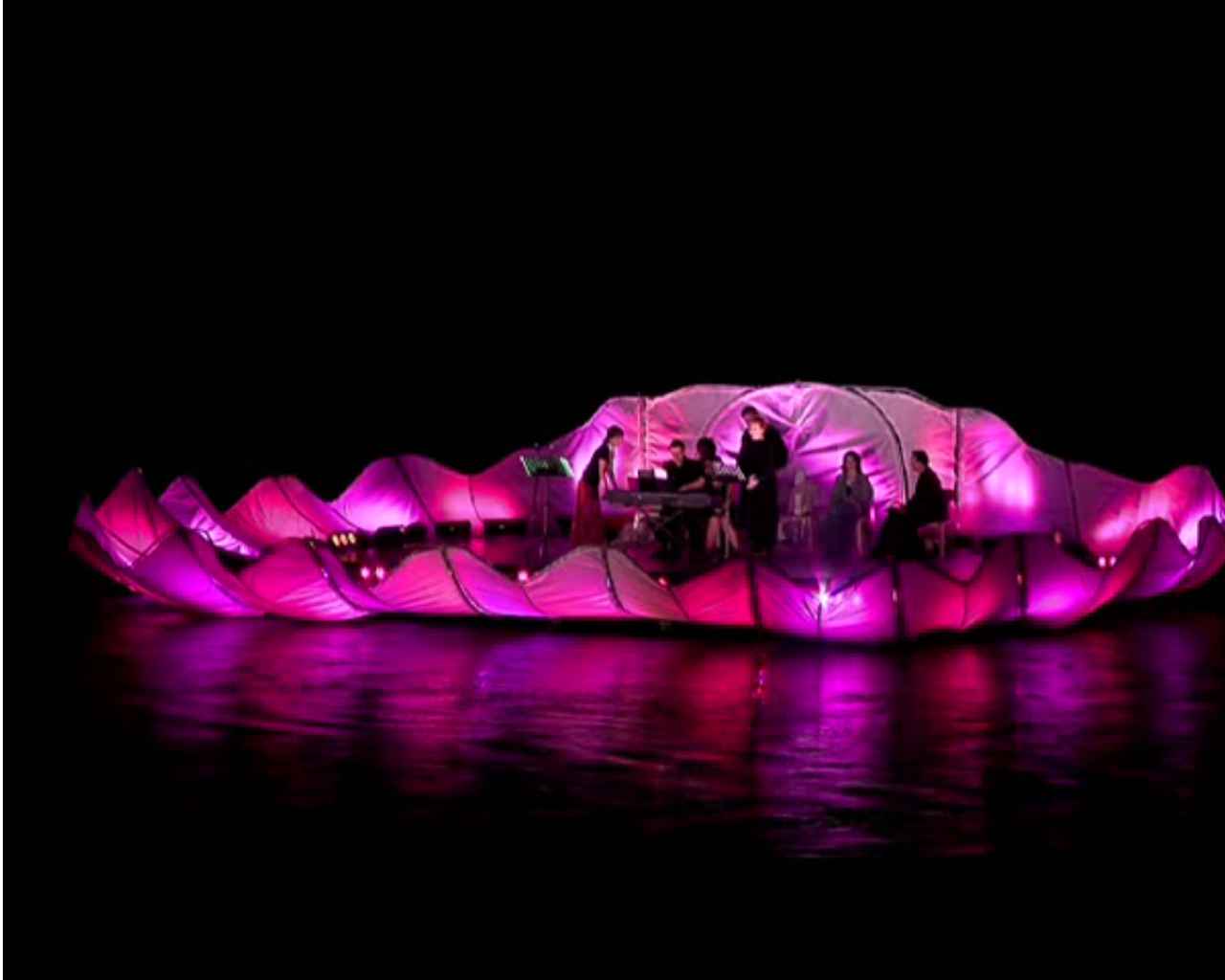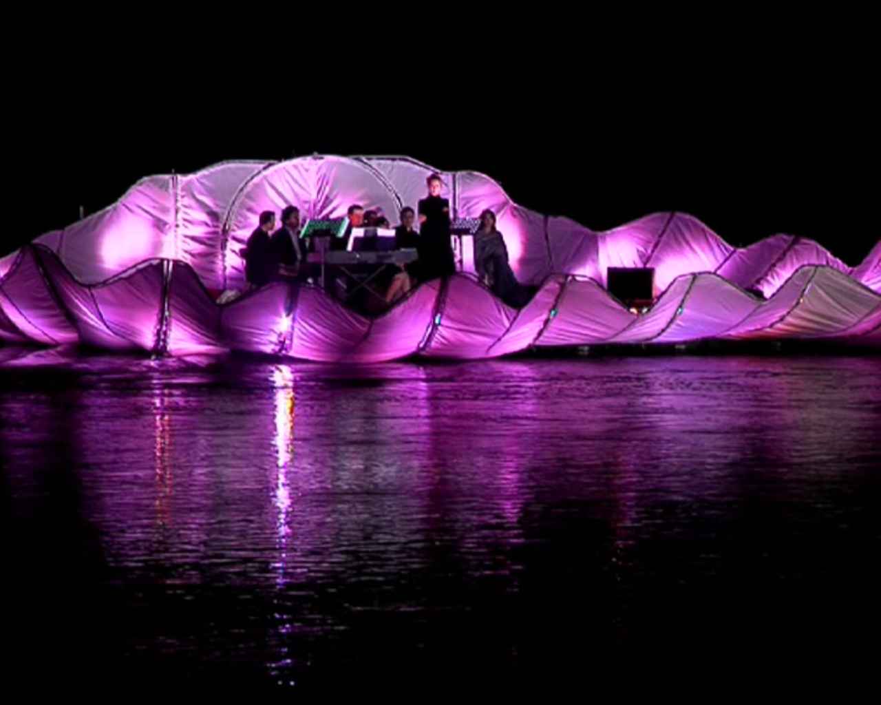 La scénographie s’appuie sur une « œuvre plastique » flottante éphémère, un écrin pour les artistes et une transfiguration de l’environnement.