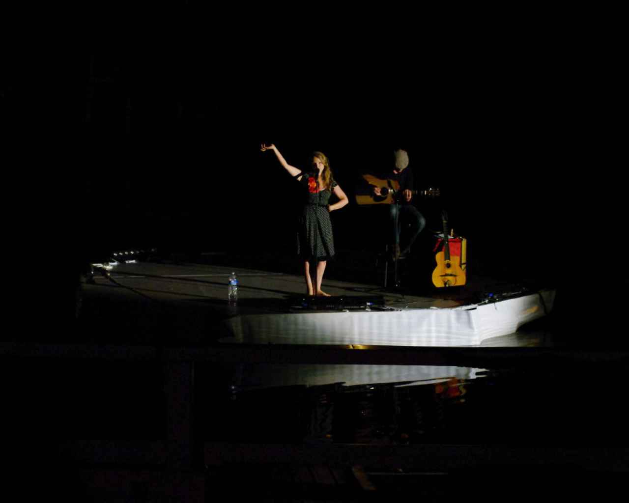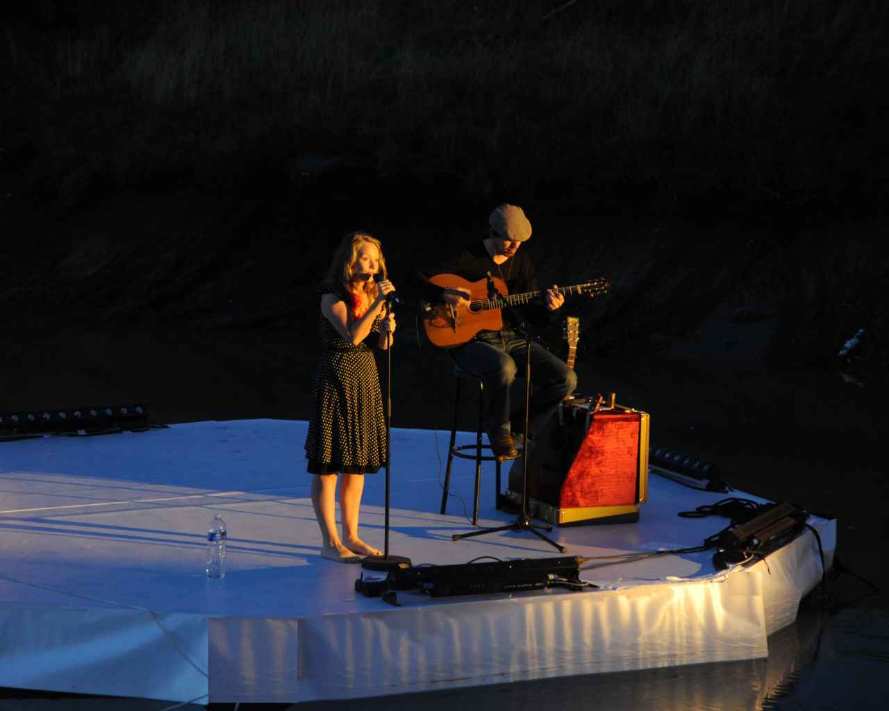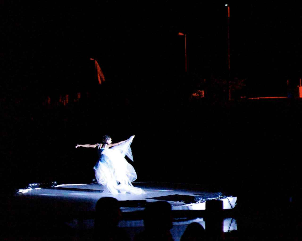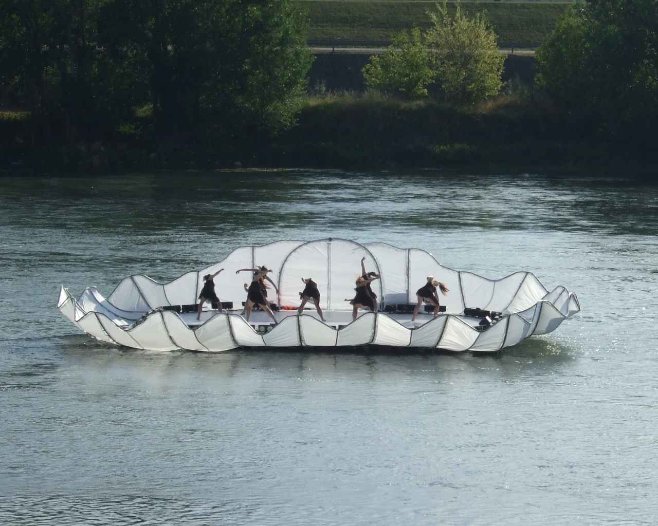 La scénographie s’appuie sur une « œuvre plastique » flottante éphémère, un écrin pour les artistes et une transfiguration de l’environnement.