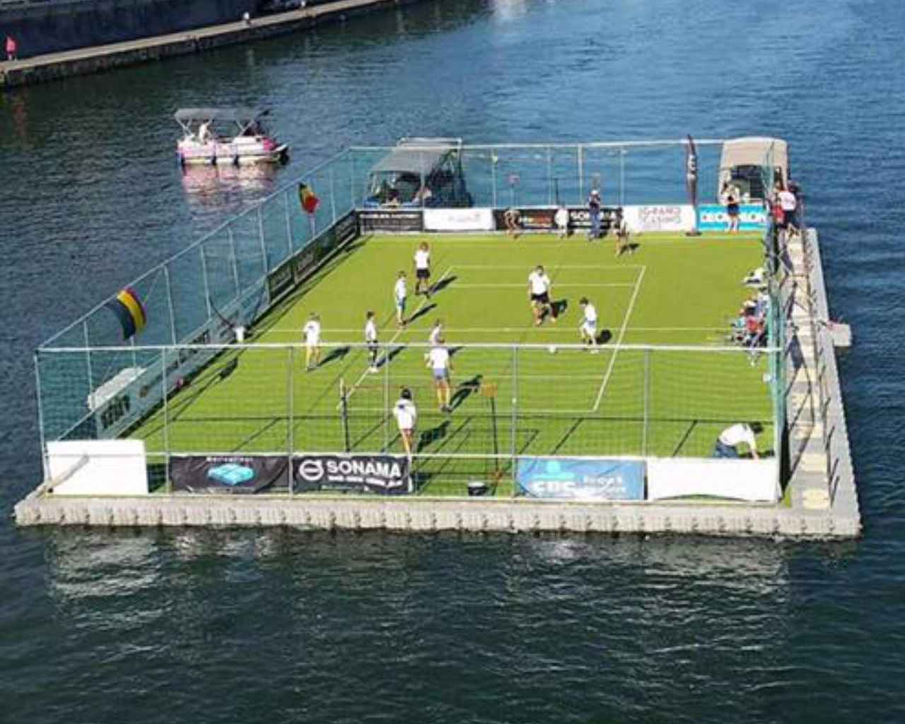 Transposé dans un site insolite avec l'eau pour ligne de jeu, le terrain de football flottant offre une expérience unique de courir sur l'eau, de nouvelles sensations de jeu et est un magnifique écrin pour le football avec la nature pour décor.